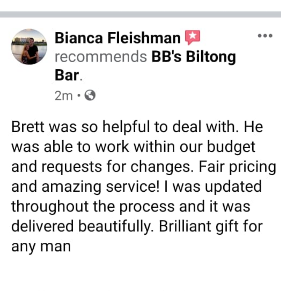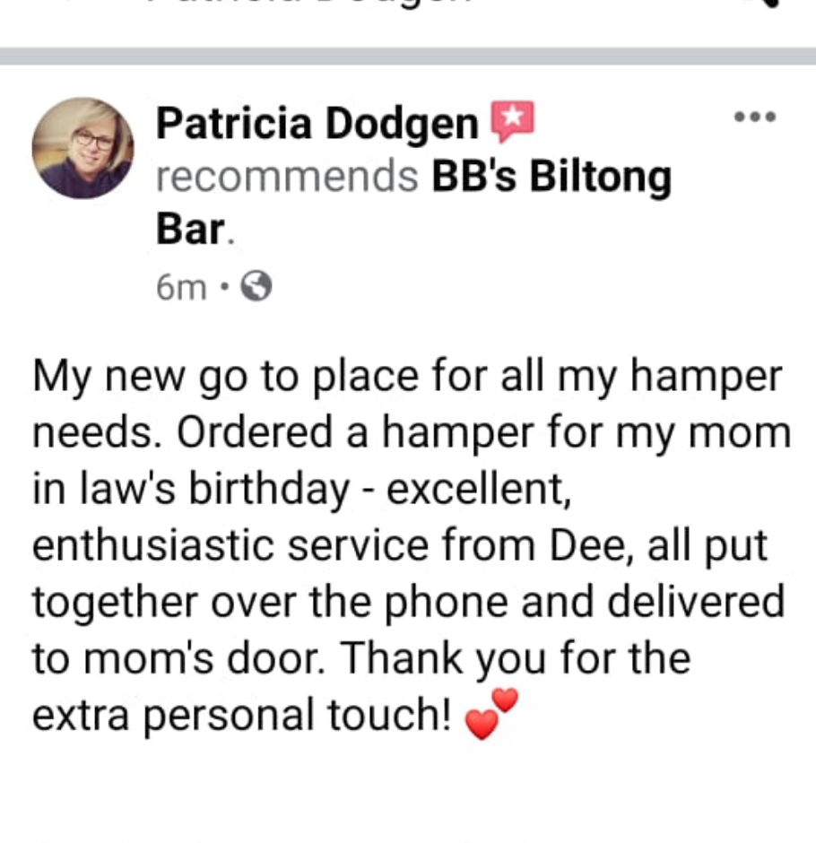 During Lockdown, this husband & wife team founded D’s Delites (the Sweet Treat division of BB’s Biltong Bar). D’s Delites offers a range of Deelicious sweet treats & baked products, as well as tailor made meals according to client’s specific requests. They also offer tailor made gift care hampers, suited to your budget, for all occasions – birthdays, anniversaries, celebratory moments or “Just because you care”.
